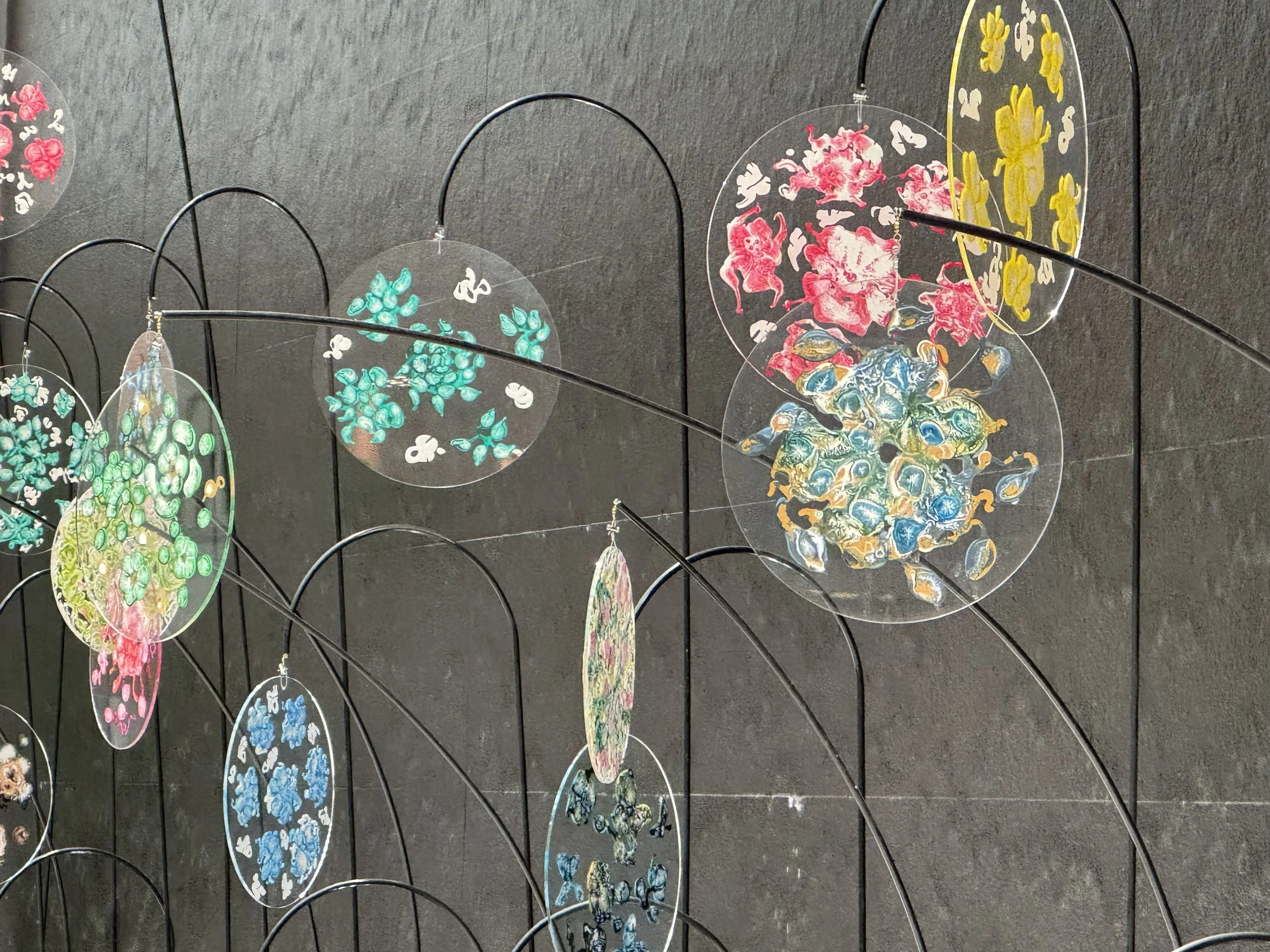 Inspirée par la thématique « Les étrangers, partout », je propose quatre diptyques de sept mètres cinquante et une installation intitulée Un jardin imaginaire. Cette dernière se compose de disques transparents suspendus à des tiges métalliques sur lesquels sont projetés des dispersions d’encre formant des arborescences florales.