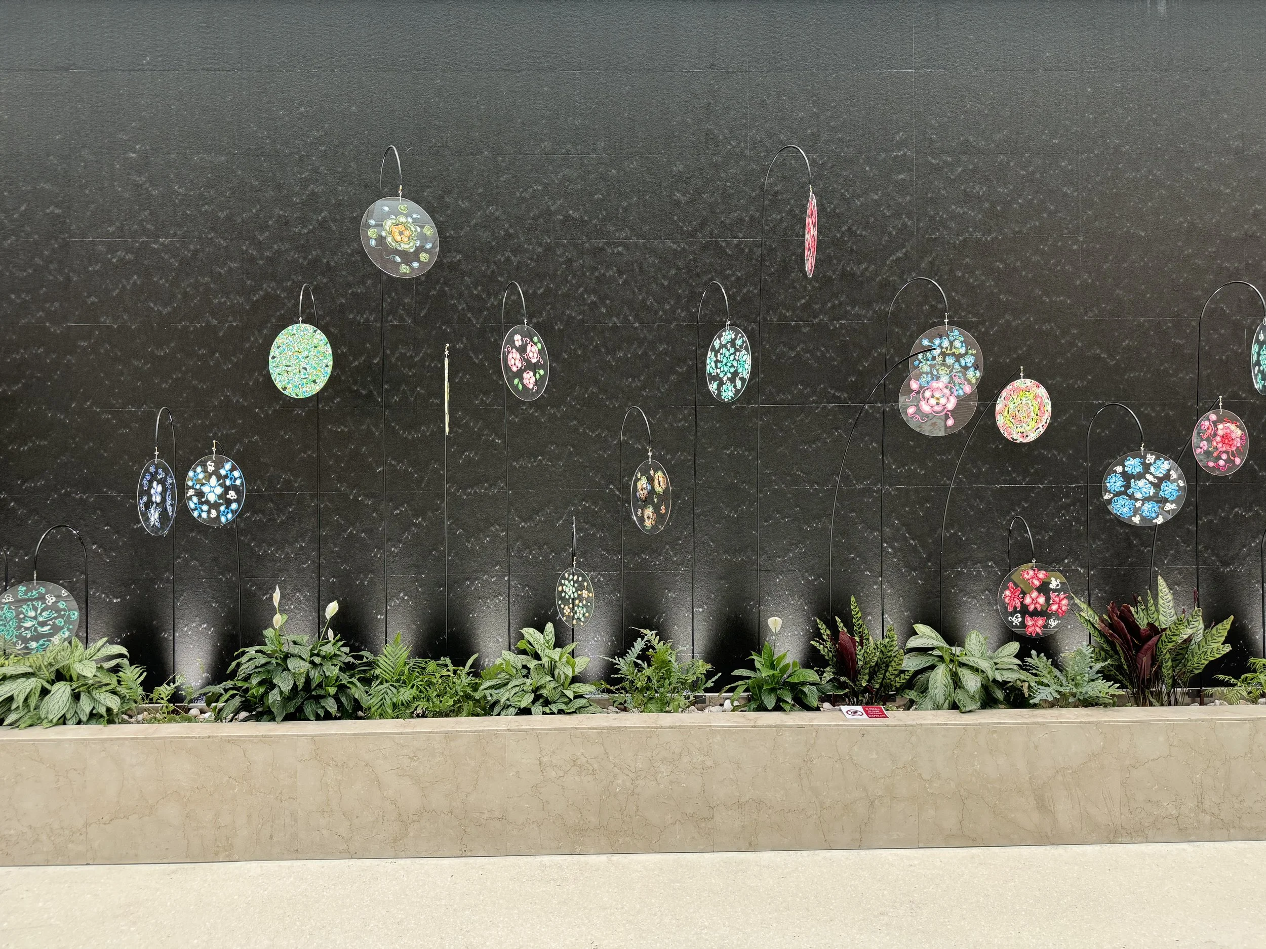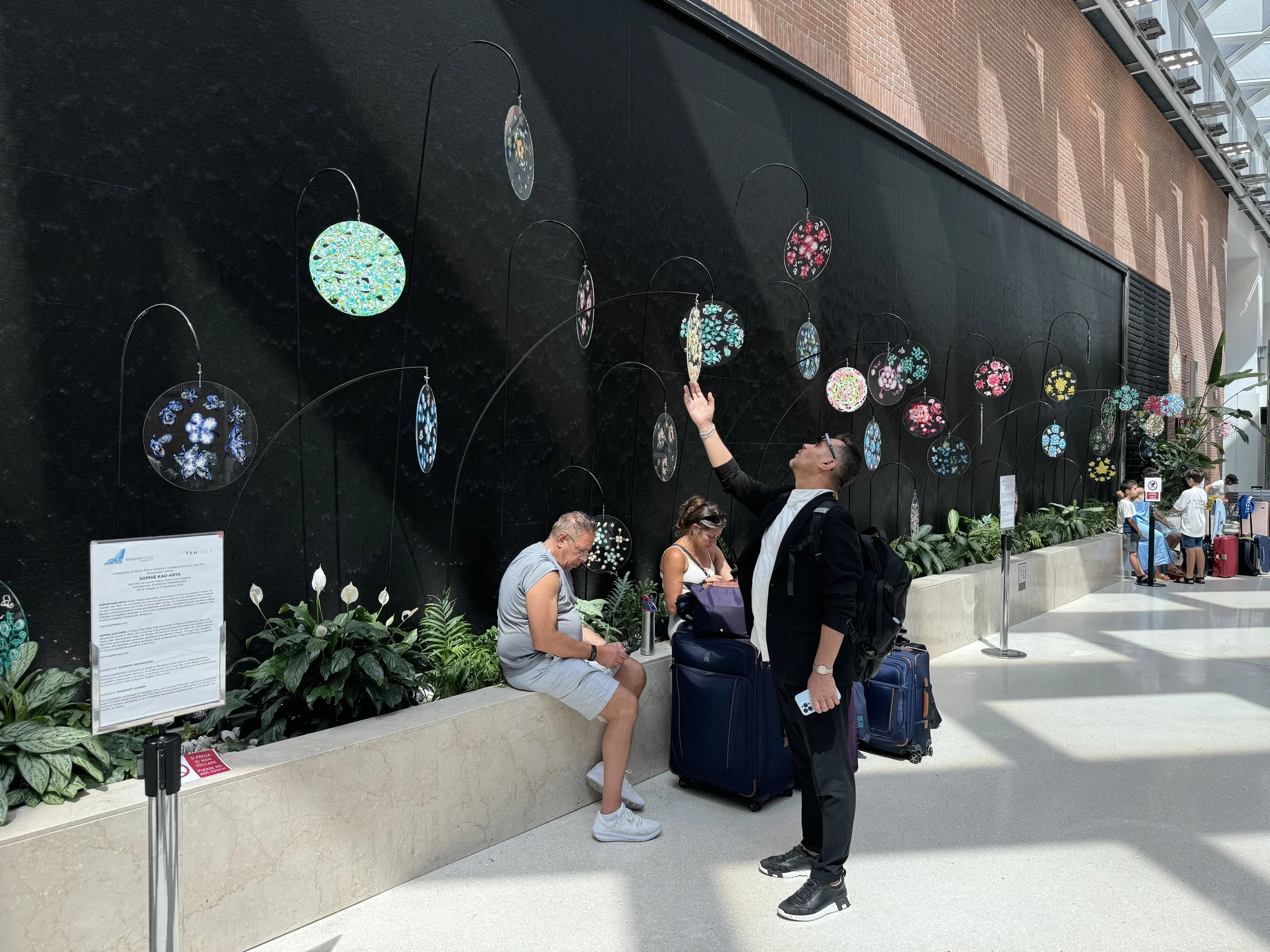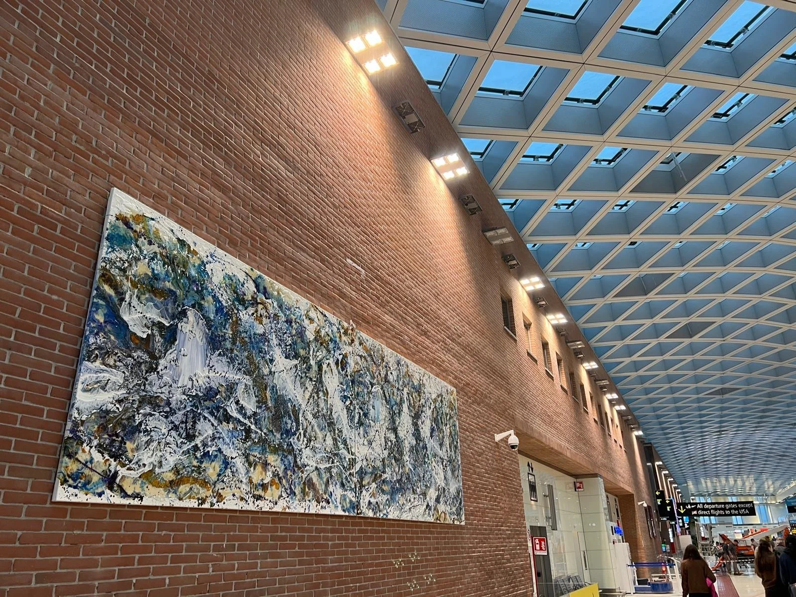 Sur les murs du hall principal de l’aéroport sont accrochés les diptyques apocalyptiques, et en face d’eux, devant un mur d’eau de onze mètres se trouve Un Jardin Imaginaire, composé de belles fleurs artificielles.