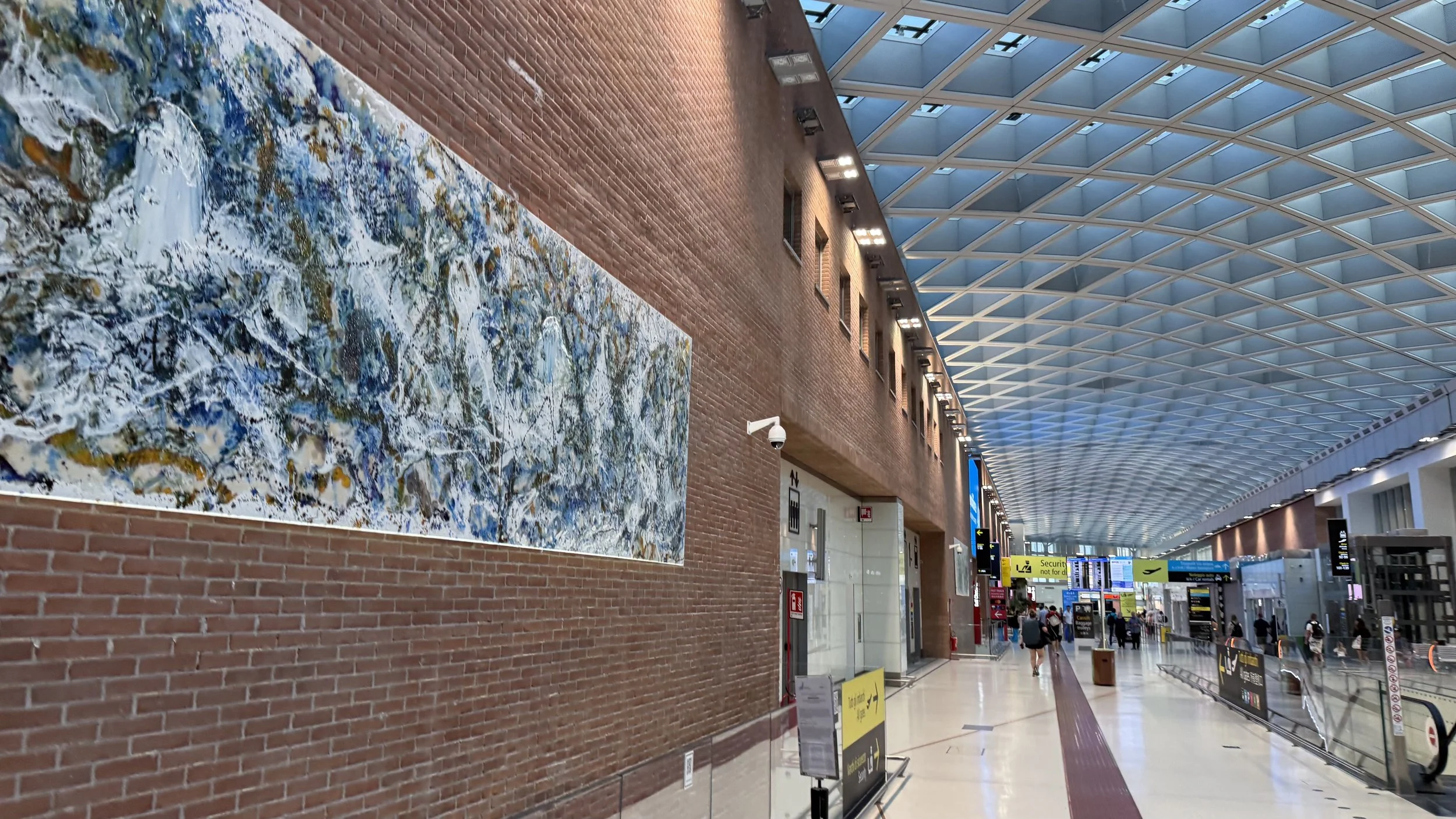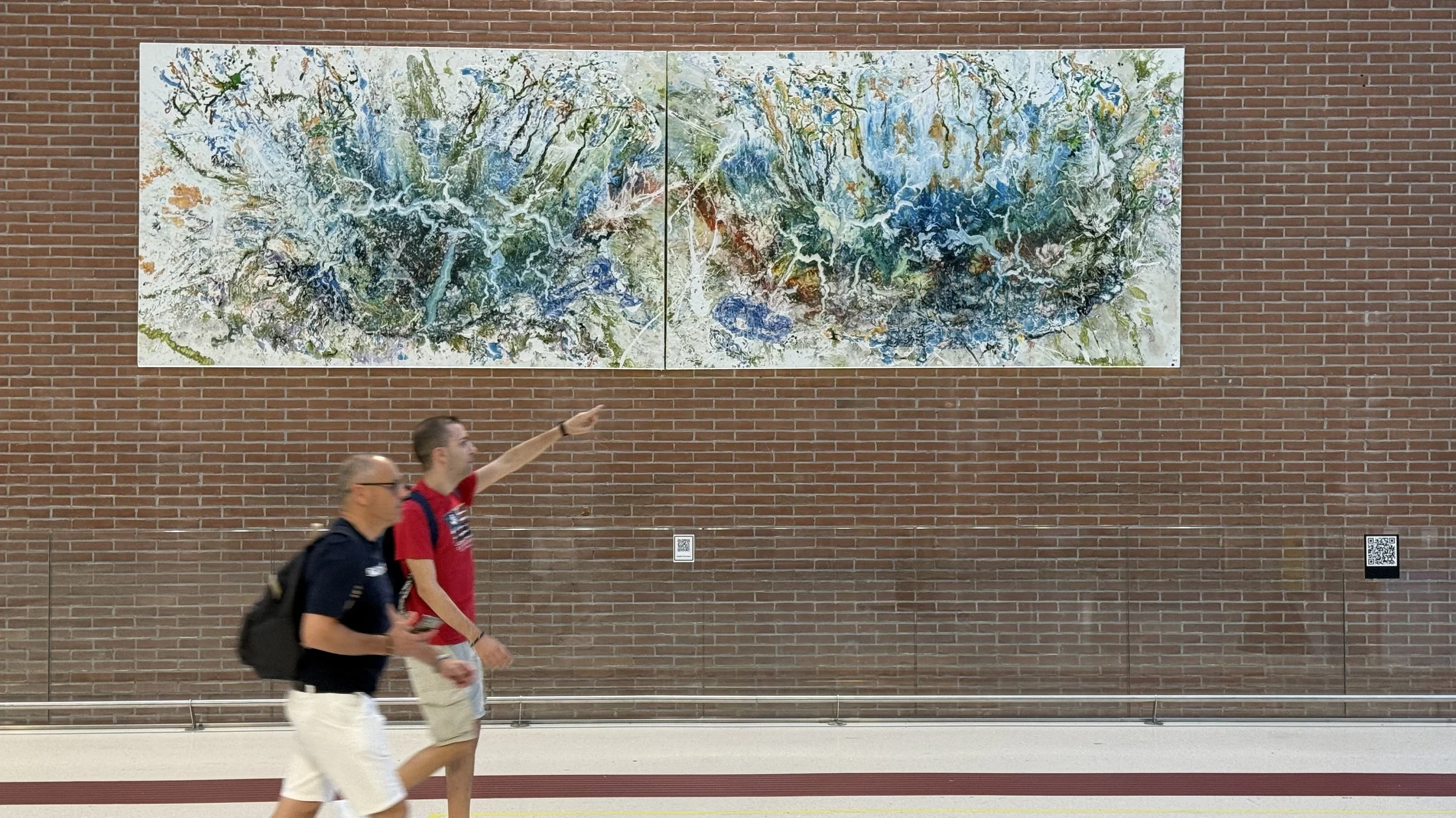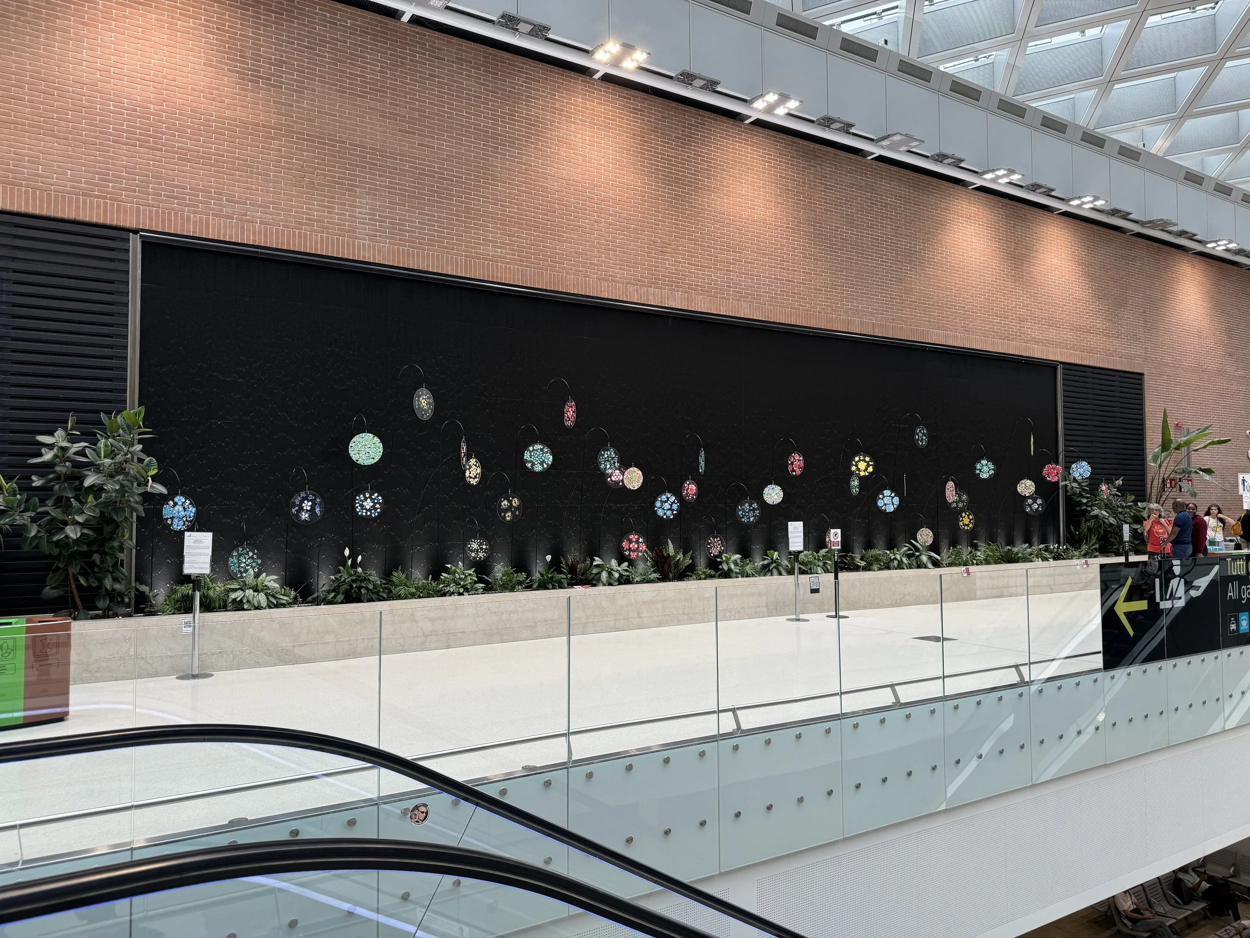 Sur les murs du hall principal de l’aéroport sont accrochés les diptyques apocalyptiques, et en face d’eux, devant un mur d’eau de onze mètres se trouve Un Jardin Imaginaire, composé de belles fleurs artificielles.