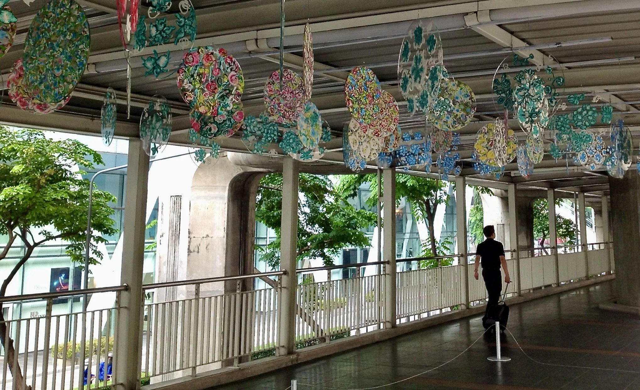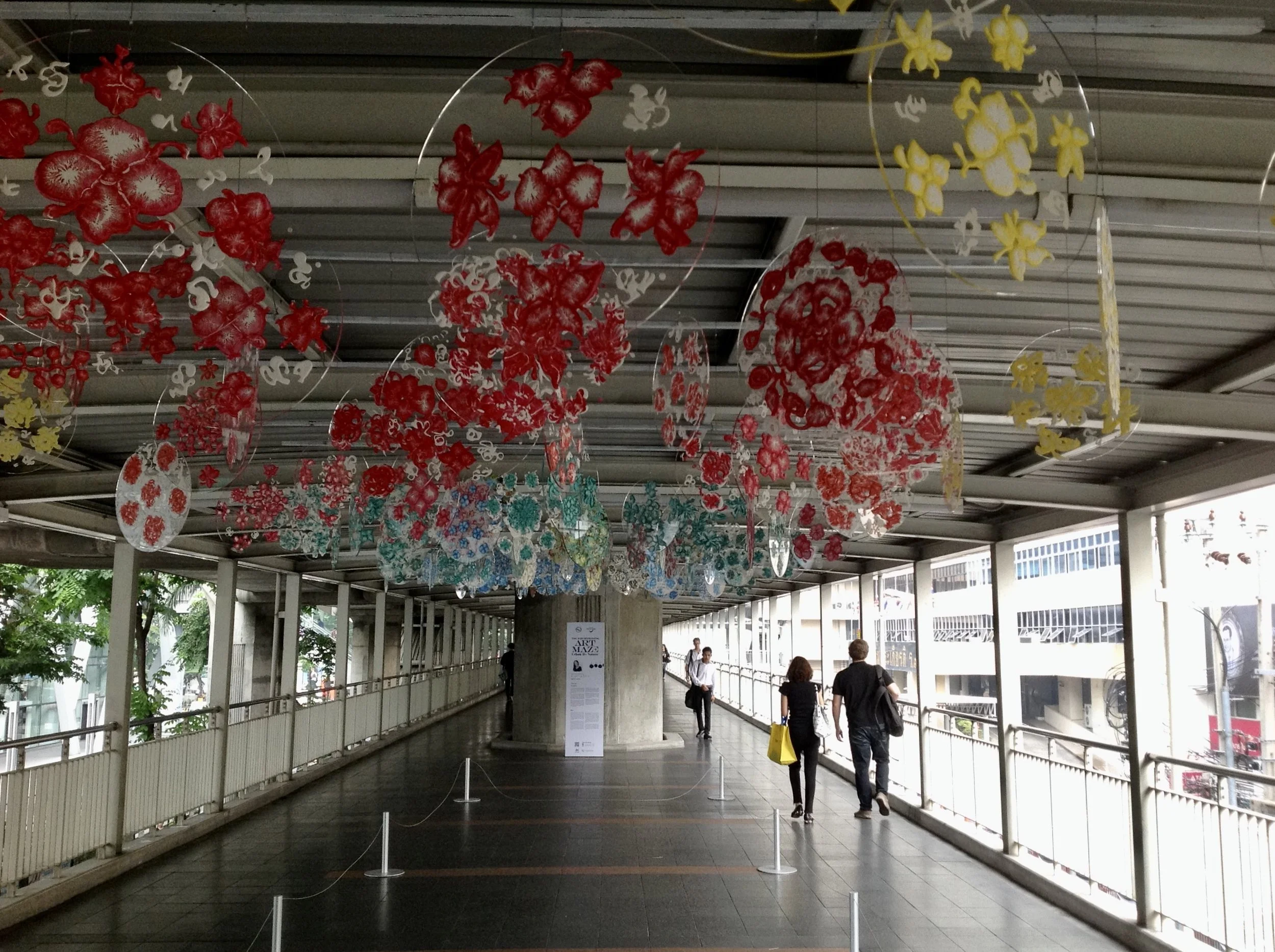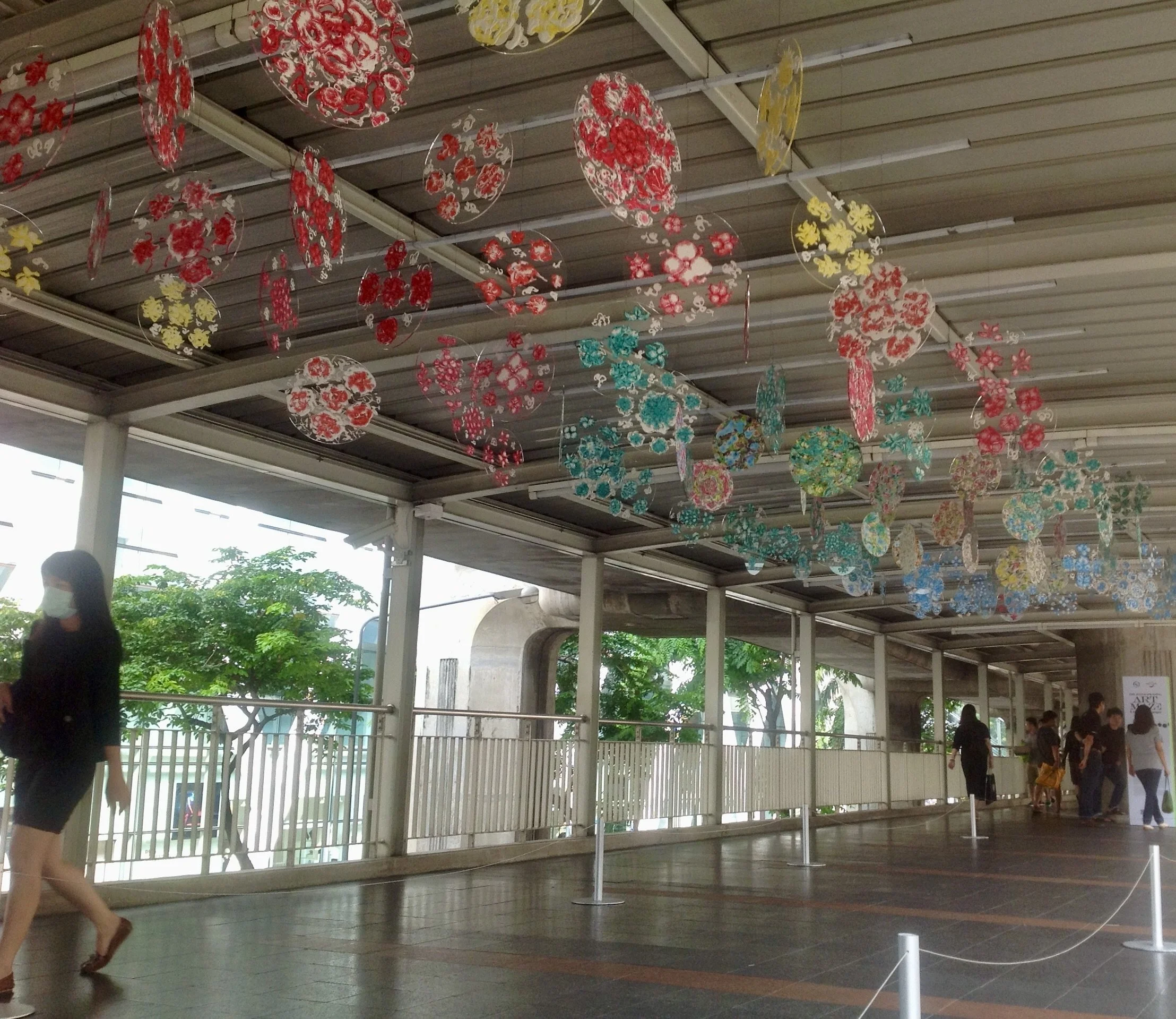 En 2016, dans le cadre de l’exposition Urban by Nature, à Bangkok (Thaïlande), et pour ma première installation, j’ai présenté un mobile composé de 133 disques en acrylique peints d’arborescentes florales, suspendus aux barres métalliques d’une passerelle du métro aérien, de Chitlom-Central World qui reçoit 40 000 personnes par jour.