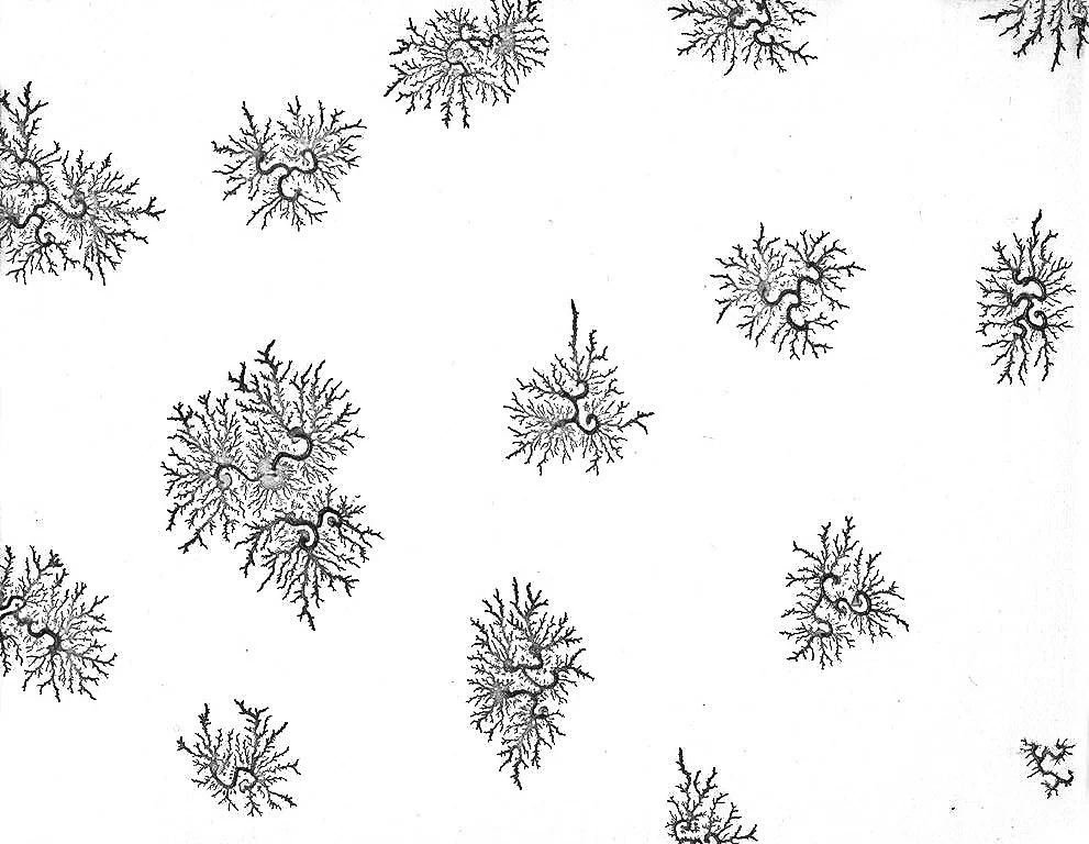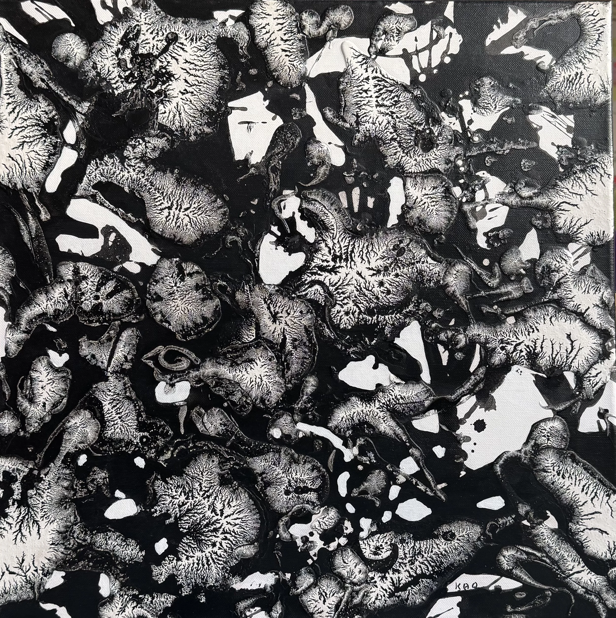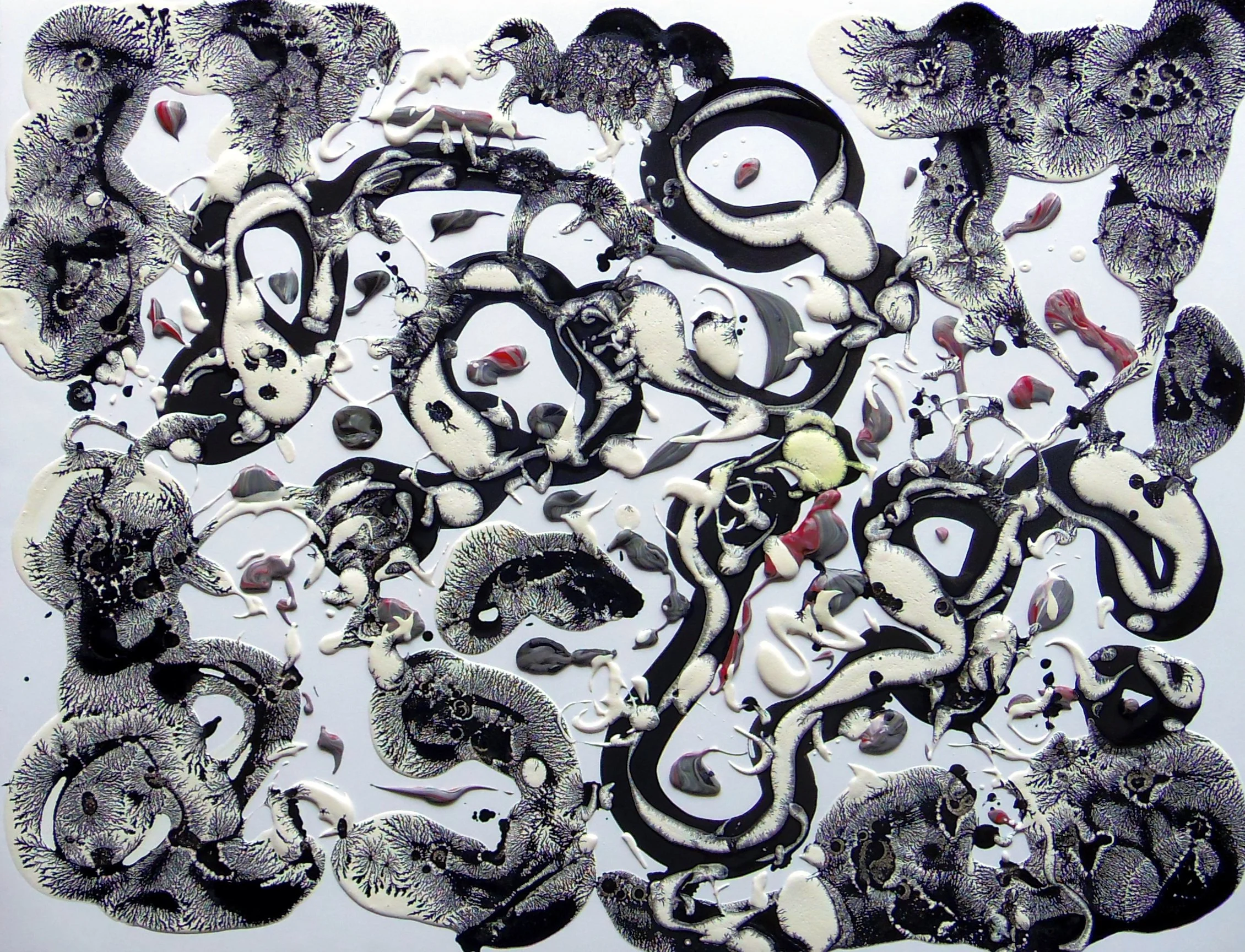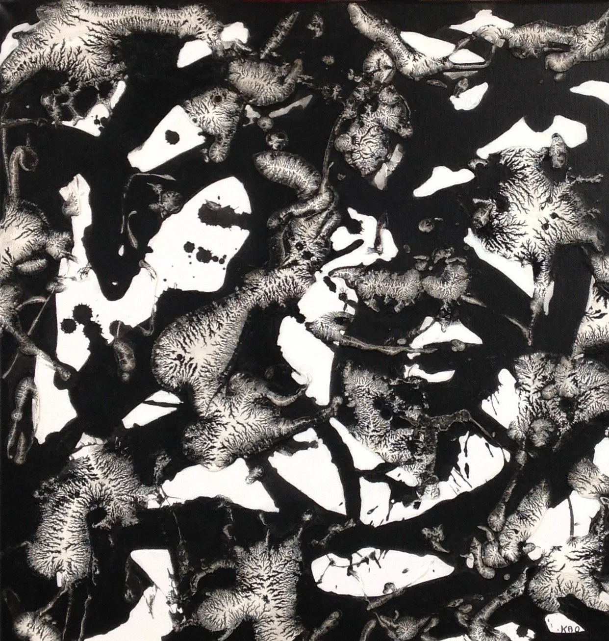 Technique : apport massif d’encre de chine sur une base liquéfiée de liants et sélection d’un tableau de petit format pour une propagation plus éparse et rapide.