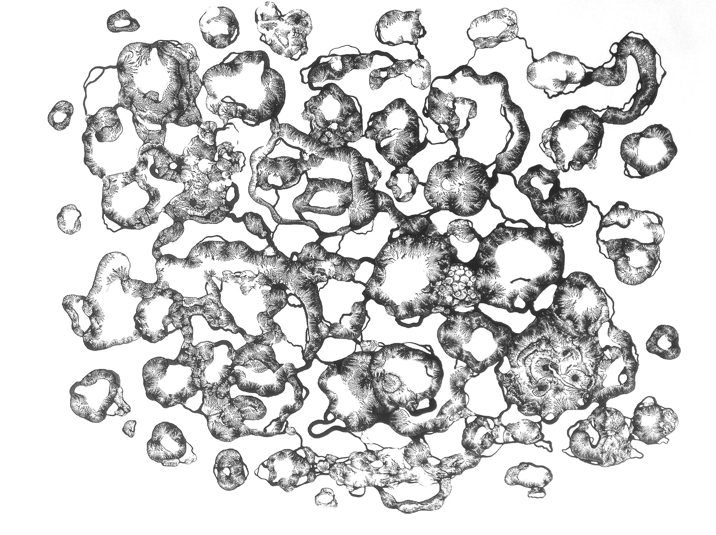 Dans un jeu d’ombres et de lumières, le tableau se compose d’entrelacs et d’arborescences fractales évoquant un ciel de forêt.